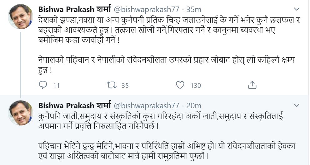 नेपाली कांग्रेसले देशको राष्ट्रिय झण्डा जलाउनेलाई कारबाही गर्न माग गरेको छ । प्रवक्ता विश्वप्रकाश शर्माले ट्विटमार्फत् सरकारसँग नेपालको राष्ट्रिय झण्डा जलाउनेलाई कारबाही गर्न माग गरेका छन् ।