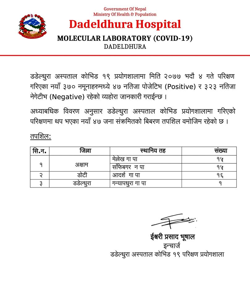 डडेल्धुरा प्रयोगशालामा गरिएको परीक्षणमा थप ४७ जनामा कोरोना पुष्टि