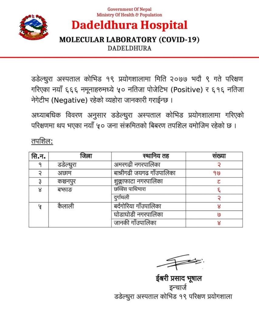 डडेल्धुरा अस्पतालको प्रयोगशालामा गरिएको परिक्षणमा ५० जनामा कोरोना संक्रमण पुष्टि भएको छ । अस्पतालका ईन्चार्ज ईश्वरी प्रसाद भुषालका अनुसार ५० जनामा कोरोना संक्रमण पुष्टि भएको हो ।