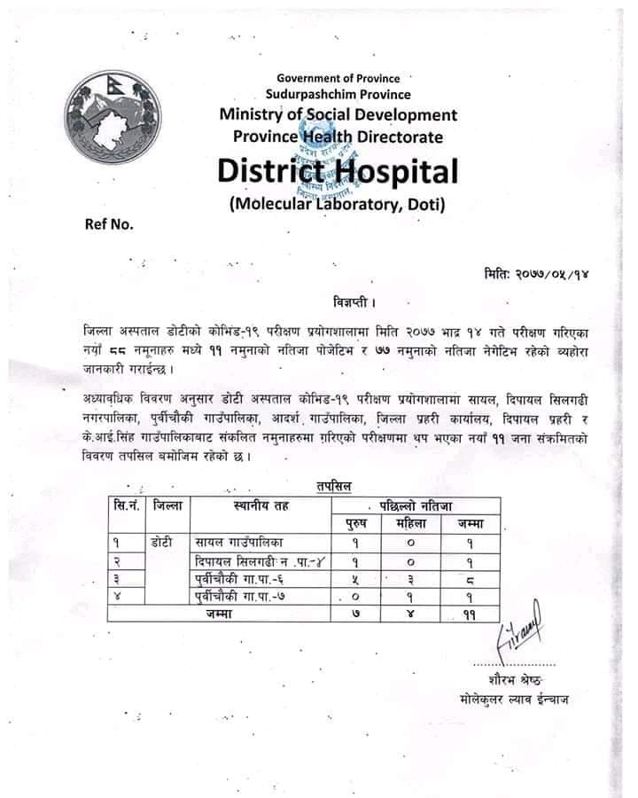 डोटि अस्पतालका प्रयोगशाला ईन्चार्ज शौरभ श्रेष्ठका अनुसार संक्रमण पुष्टी हुनेमा सबै डोटीका हुन् ।