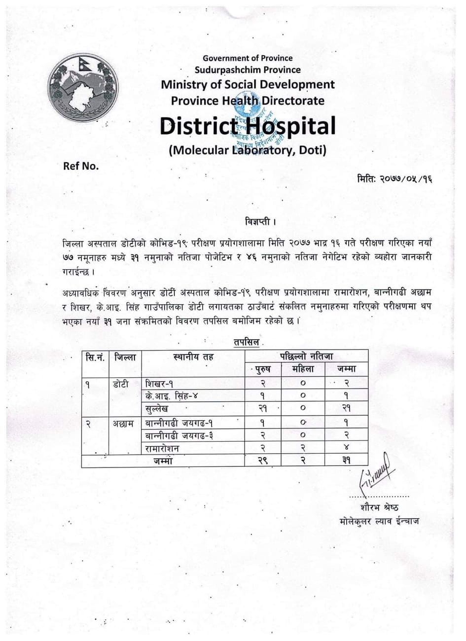 अस्पतालका प्रयोगशाला इन्चार्ज शौरभ श्रेष्ठका अनुसार डोटीका २४ र अछामका ७ जना गरी ३१ जनामा संक्रमण पुष्टि भएको बताउका छन ।