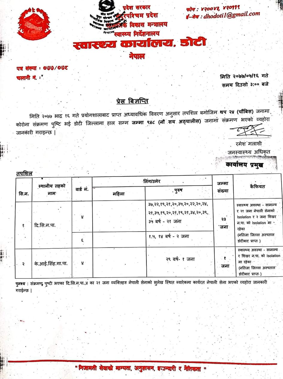 जिल्ला स्वास्थ्य कार्यालय डोटीले २१ जना नेपाली सेना राजपुर दिपायलमा कार्यरत रहेको बताइएको छ । भने, अन्य संक्रमित दिपायल सिलगढी नगरपालिकाका –६ का २ पुरुष र केआईसिंह गाउँपालिका १ पुरुषमा कोरोना भाइरसको संक्रमण देखिएको जनाइएको छ।
