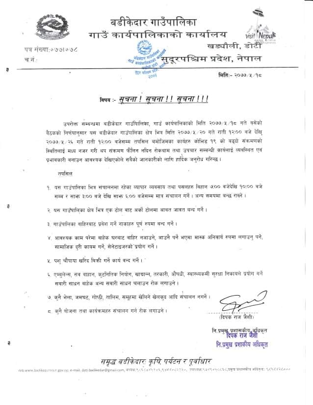 बडीकेदार गाउँपालिकाका अध्यक्ष कृष्ण बहादुर चन्दले गाउँपालिकाको भाद्र १८ गते बिहीबार बसेको कार्यपालिकाको बैठकले गाउँपालिका क्षेत्र भित्र भाद्र २० गते राति १२ बजे देखि २६ गते राति १२ बजे सम्मका लागि गाउँपालिका भित्र आवत जावतमा पूर्ण रूपमा रोक लगाउनुका साथै गाउँपालिका सँग जोडिएका सम्पूर्ण नाकाहरू बन्द गर्ने निर्णय गरेको बताएका छन ।