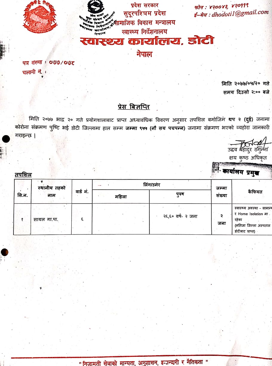जिल्ला अस्पताल डोटीको प्रयोगशालाका इन्चार्ज शौरभ श्रेष्ठले दिएको जानकारी अनुसार कोरोना संक्रमण पुष्टि भएका दुबै जना पुरुष डोटीको सायल गाउँपालिका वडा नम्वर ६ का हुन् ।