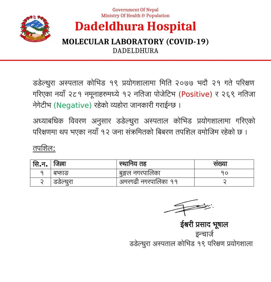 प्रयोगशाला इन्चार्ज ईश्वरी प्रसाद भुसालले पछिल्लो २४ घण्टामा २ सय ८१ जनाको परीक्षण गरिएकोमा १२ जनामा कोरोना पुष्टि भएको बताएका छन ।