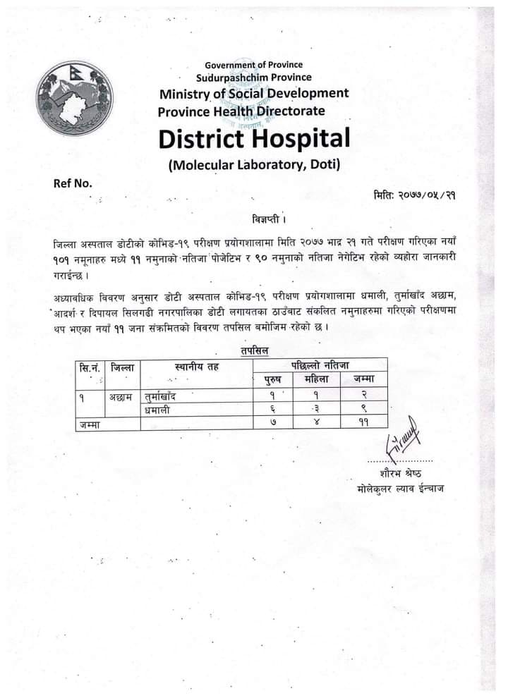 अस्पतालका प्रयोगशाला इन्चार्ज श्रेष्ठले ७ पुरुष र ४ महिला गरी थप ११ जनामा कोरोना भाइरसको संक्रमण देखिएको बताएका छन । उनका अनुसार डोटी जिल्ला अस्पतालको प्रयोगशालामा भएको परीक्षणमा सबै ११ जना अछामको तुर्माखाँद गाउँपालिका रहेका छन ।